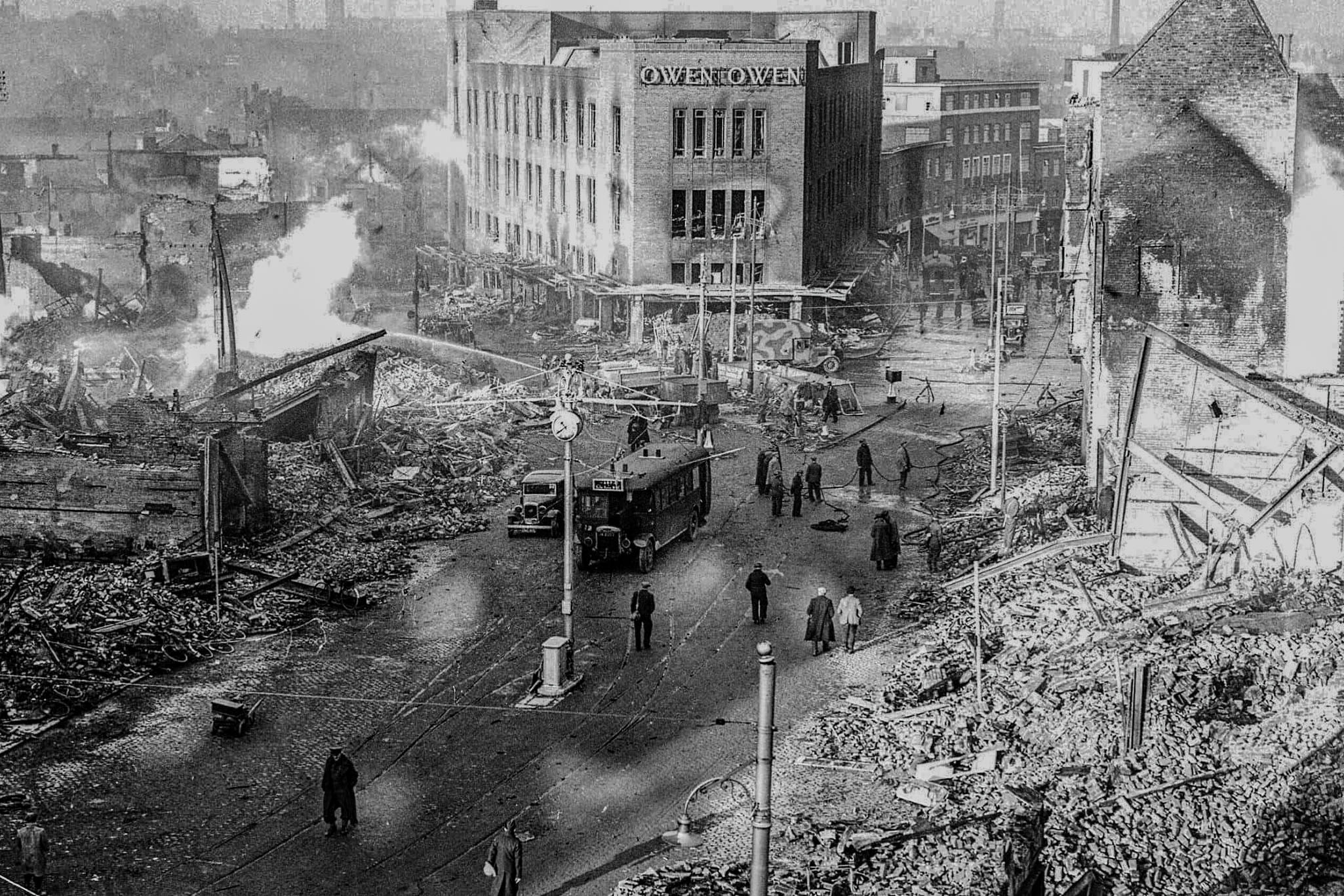 On the evening of 14 November 1940, waves of German bombers crossed the city under a clear, moonlit sky. High-explosive bombs were dropped early in the raid, severing water mains, power lines, and damaging rooftops across Coventry. This deliberate tactic crippled emergency services and made it almost impossible to control the fires that followed. As the night progressed, thousands of incendiary bombs rained down, igniting buildings across the city and turning streets into burning corridors of destruction.