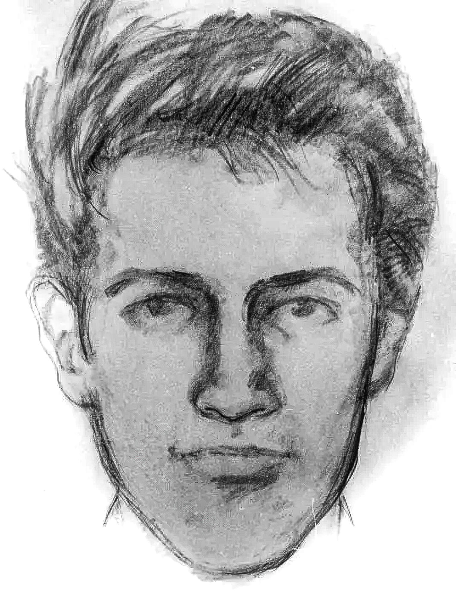 A pencil-drawn composite sketch of a young man with messy hair and dark eyes.