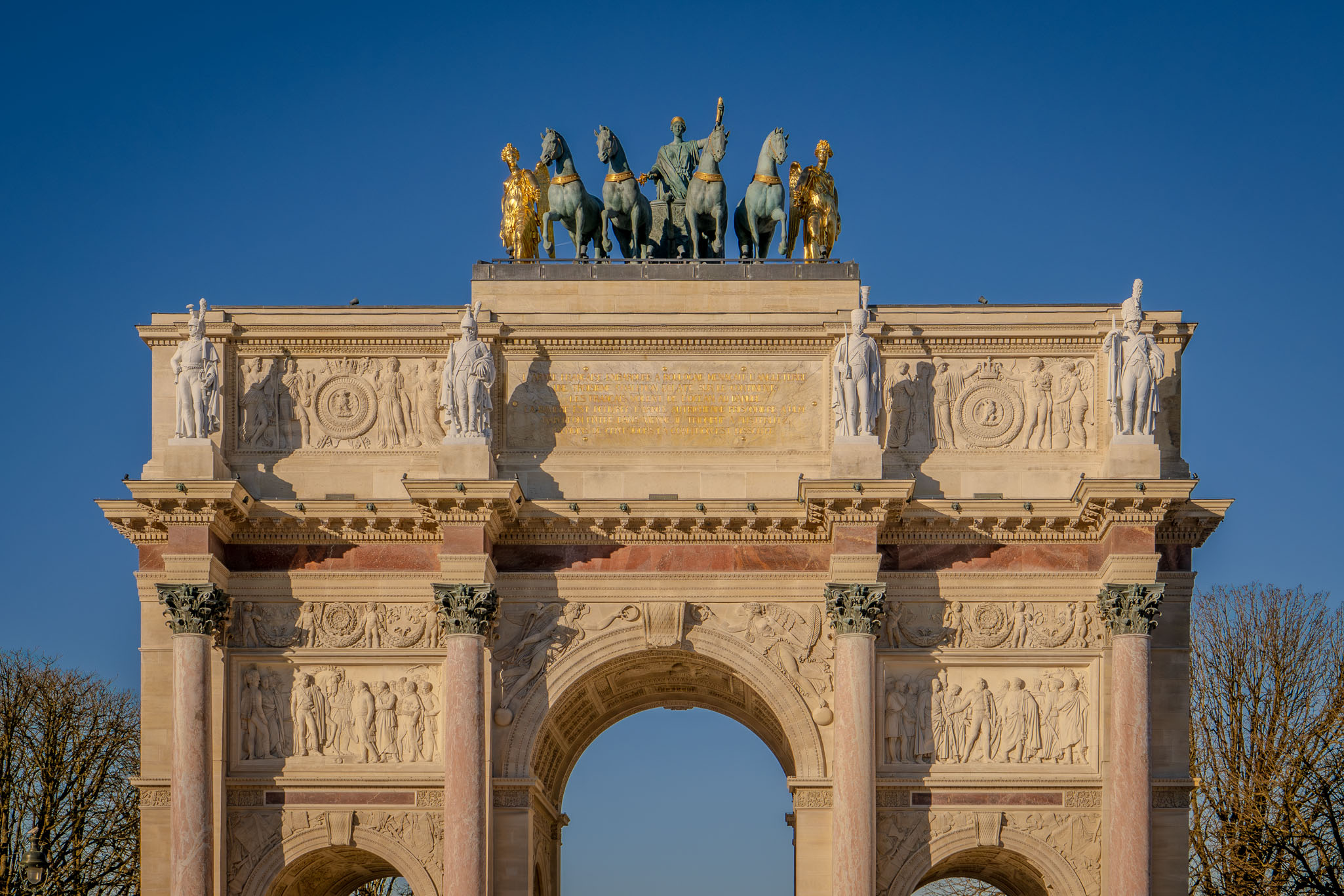 Often overshadowed by its larger counterpart, this smaller arc is worth a pause. Built by Napoleon to celebrate his 1805 victories, it once marked the entrance to the Tuileries Palace. The bronze quadriga on top, pulled by four horses and guided by figures representing Victory and Peace, finishes it off with confidence.