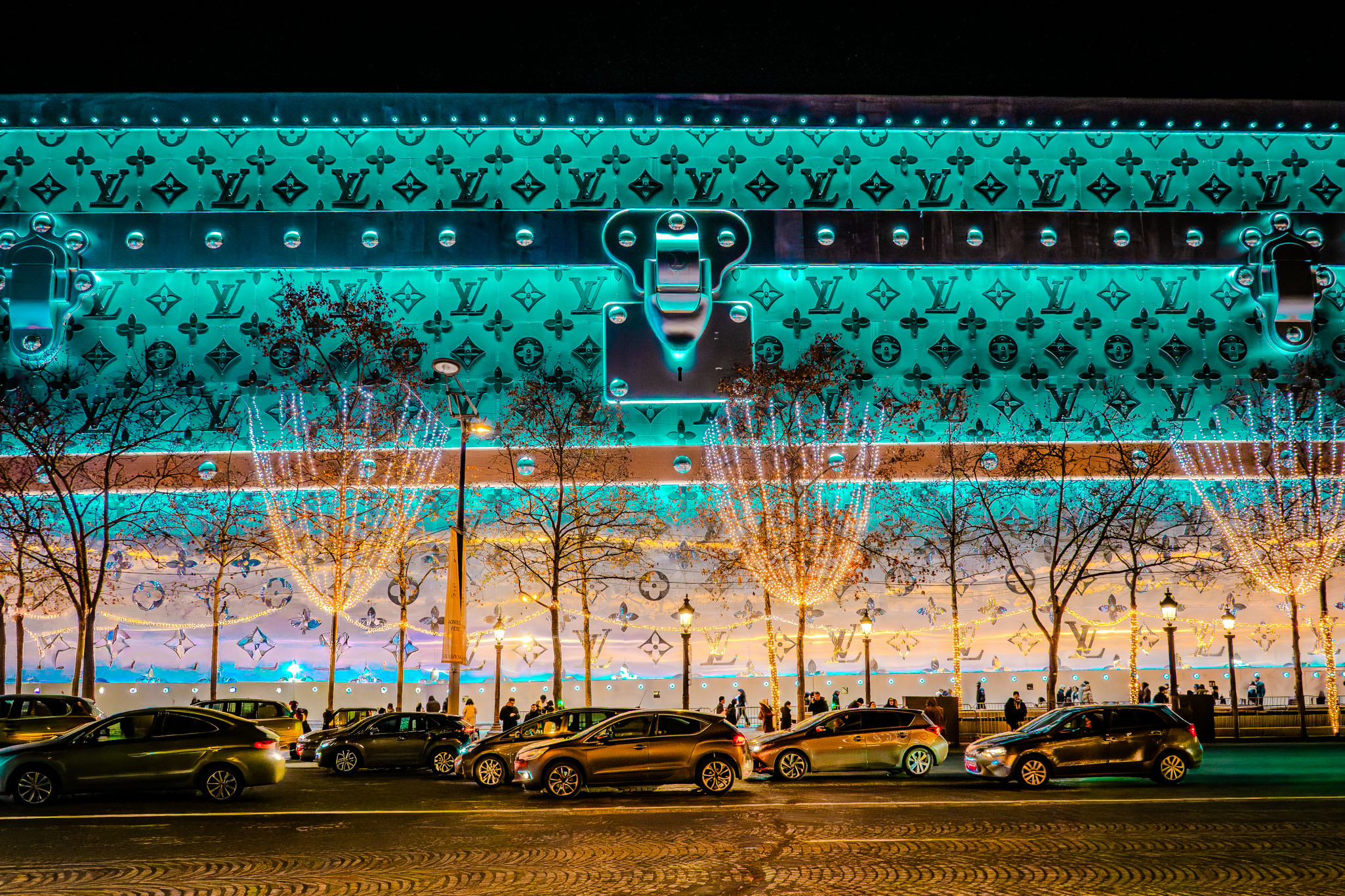 Paris doesn’t hold back with Christmas displays. The standouts for us were Christian Dior, Chanel, and the Louis Vuitton building, which is currently under construction but wrapped to resemble a giant LV monogram trunk. It’s bold, slightly absurd, and impossible to ignore.